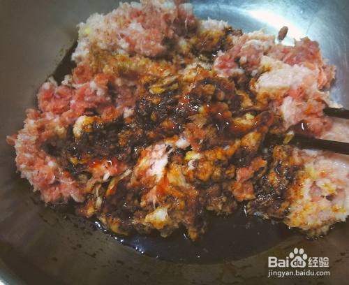 向肉糜中加入适量老抽和生抽,葱姜末沿着一个方向搅拌均匀