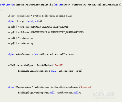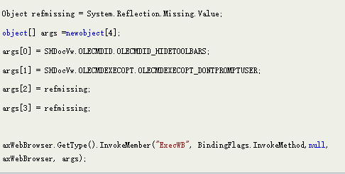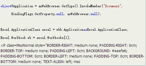 这里要注意,WebBrowser加载Excel文档后,并不显示工具栏,为此我们需要使用高级一点的技术,通过反射调用底层的方法来实现,首先我们需要找到WebBrowser封装的AxWebBrowser控件。