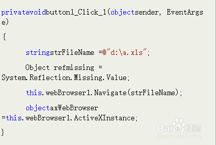 在你的工具栏上选择WebBrowser控件,将其放到你的Form,在Form上增加一个控件来使其加载一个Excel文件,如下:Button的事件处理程序: