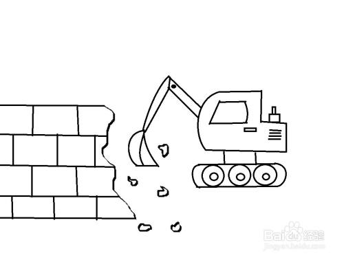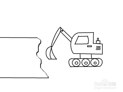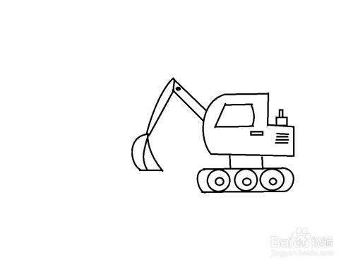把挖掘机的挖斗画好,把轮子也画完整,如图所示。