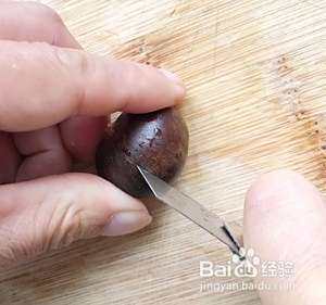 用上面神器的忽略这一步。板栗冲洗干净,按在砧板上,鼓的那面向外,从上往下划一刀,不需要太深,割破外皮就行。其实怎么划都行,横着竖着或者十字都无关紧要,关键是划出裂口就行,自己觉得怎么顺手怎么来,注意安全。