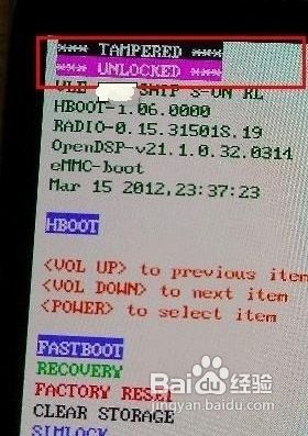 重启手机,进入fastboot模式(就是按住音量-和开机键,手机左上角出现一堆英文,即代表进入hboot模式;再按电源键,进入fastboot模式)。