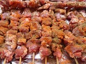 把羊肉串在竹签上,最好是在每串羊肉串的中间串上一块肥肉(不要怕哈,烤过之后非常香的呢)!