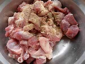 把羊肉块放在盆里,放入盐、白胡椒粉、鸡粉、辣椒粉、孜然粉,抓拌均匀后,再倒入适量的食用油拌匀。