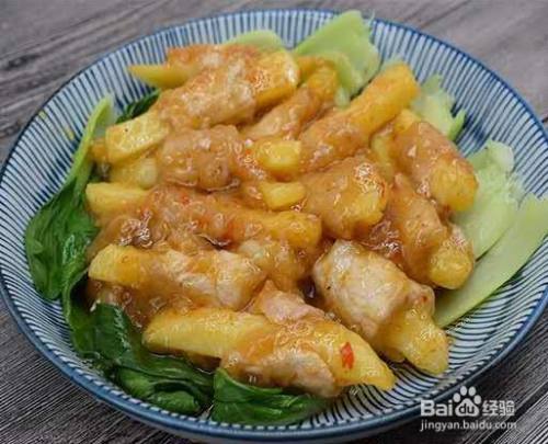 小白菜洗干净后用开水烫好,另起油锅,炸好的假排骨再次下锅,放入番茄酱一勺,白糖少许,醋适量,盐少许炒匀,最后调上点淀粉水加入翻炒均匀即可起锅