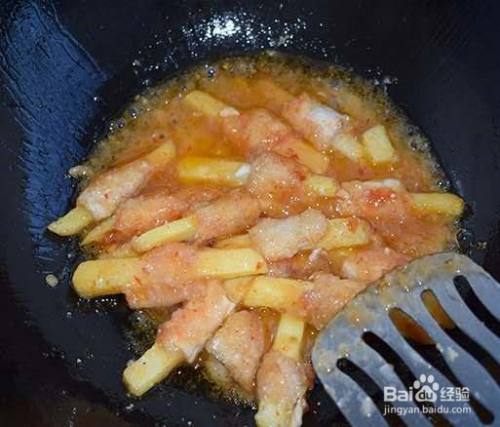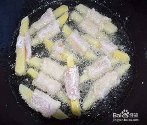 锅内热油,把裹好淀粉的土豆下锅炸至酥脆,捞起控干油