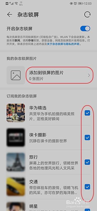 启用杂志锁屏功能后,在弹出的“订阅我的杂志锁屏”区域,勾选需要订阅内容右侧的复选框。