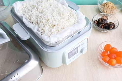 3在蒸屉上垫层纱布,把沥干水的糯米放上。一定要沥干哦!