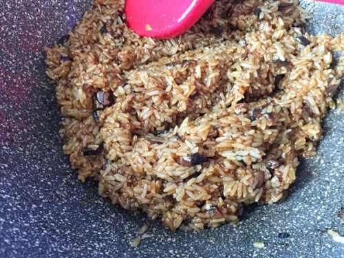 7酱料烧开后放入糯米翻炒,注意观察粘稠度,添加适量的水。