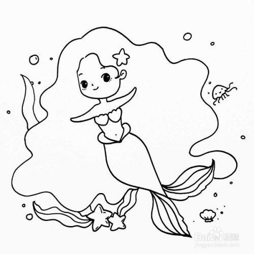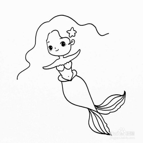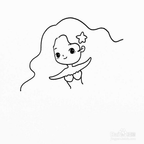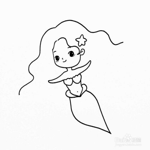 在刚刚的轮廓里我们再加上美人鱼的眼睛,嘴巴,鼻子,眉毛,还有一个小海星!如图所示。