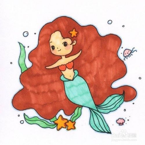 最后一步我们把美人鱼的头发延长,在画上一些海草,小鱼,泡泡,来装饰一下一副完整的美人鱼就完成了。