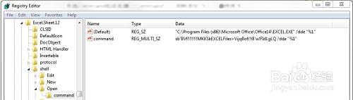 在左侧中同样展开HKEY_CLASSES_ROOT/Excel.Sheet.12/shell/Open: