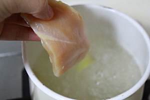 锅中放几片姜,水煮开后放入鸡胸肉,中火煮10分钟。