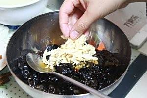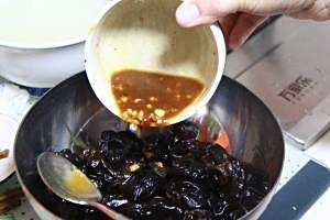 锅子烧热,调味汁搅拌均匀后倒入锅中,调味汁倒入黑木耳里。