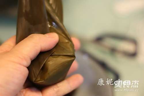 8上面的粽叶向下翻折,用绳子把粽子包结实