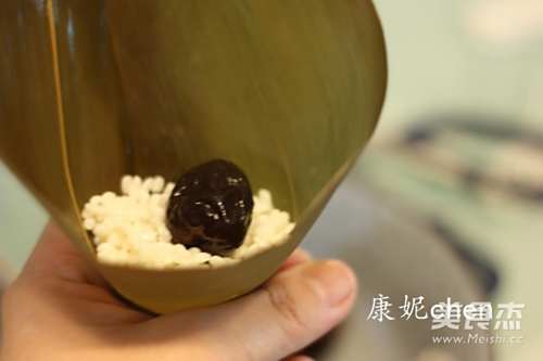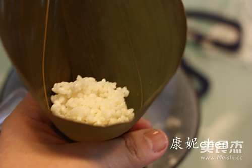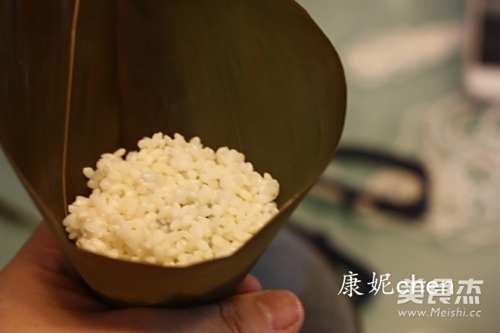 4两片粽叶加叉做成一个三角形状,放一勺糯米