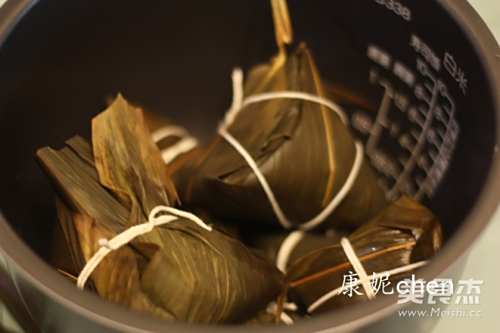 9把包好的粽子放在电饭煲里,加入没过粽子的清水,按下电饭煲的“煮饭”按键