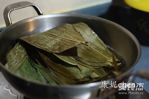 2粽叶用清水清洗干净,再放在煮锅里,煮10分钟,放凉再用