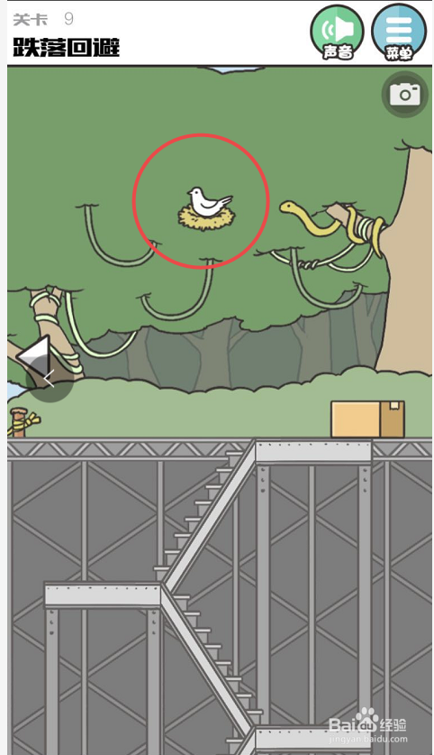在右侧的地图内,可以看见在树上有一个鸟窝,鸟窝上面有一个鸟。点击这个鸟,这只鸟就会飞走。