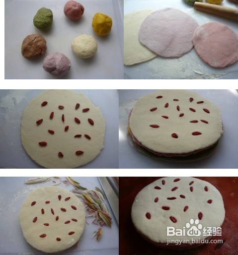 4.所有的面团全部发好,白色的再分成两份全部擀成圆面皮。