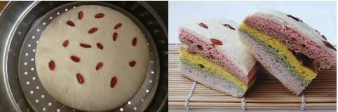 <p>七彩蒸糕的用料:面粉350克 发酵粉10克 绿茶粉5克 红曲粉5克 可可粉5克<br>发酵粉10克 奶粉30克胡萝卜2根 紫甘蓝半棵 牛奶1袋 <br></p>