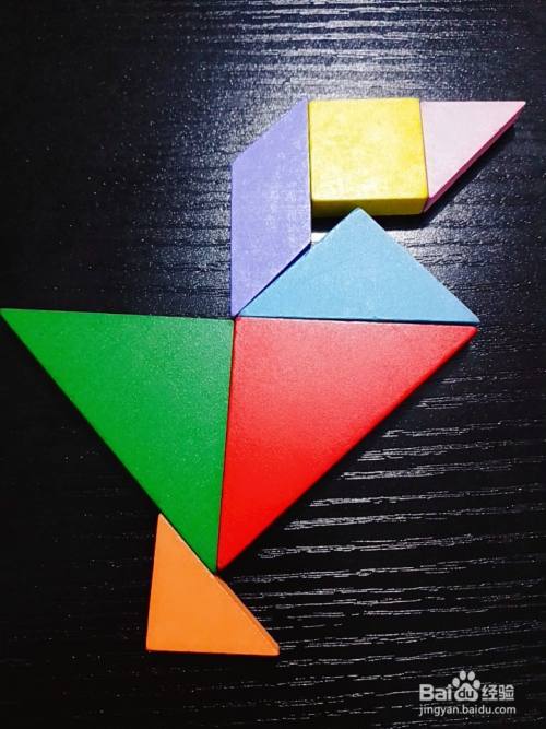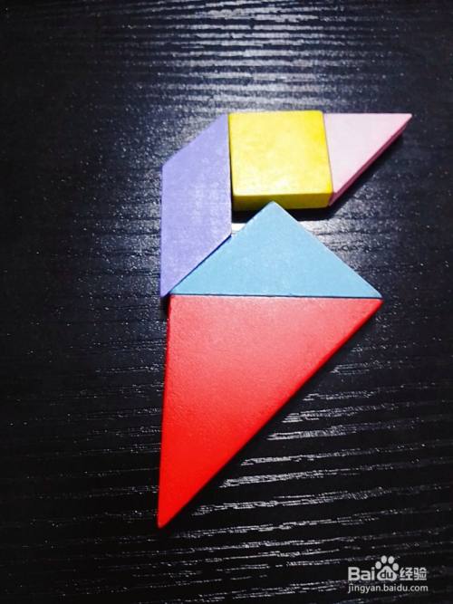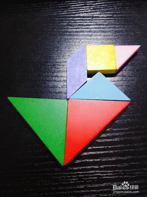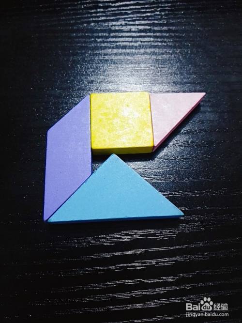 拿出一个蓝色中号三角形板放在紫色平行四边形板的右边,如图所示。