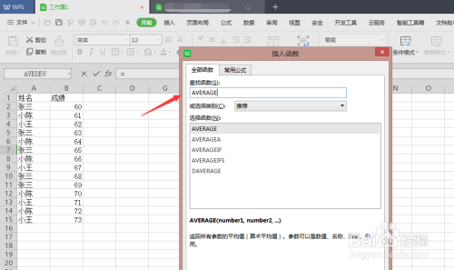 先在表格内输入平均函数,如果找不到该公式,可以在查找函数列进行搜索查找。
