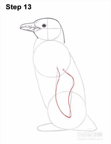 第十三步:以身体中部的形状为指导,吸引企鹅的脚蹼。遵循指南的基本路径,但在变暗时使形状圆滑。弯曲两侧的线条,使它们不那么僵硬,底部不显得尖锐。鳍的附着于身体的顶部应该相当薄。