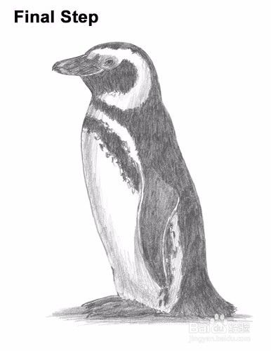 最后一步:为您的企鹅图纸添加一些阴影以获取更多细节。除了靠近中间的几个点之外,对于喙使用较暗的值。在眼睛周围使用中等数值,在头部和颈部使用黑色数值。麦哲伦企鹅沿着头部有一条厚厚的白色条纹,所以留下那一段空白。