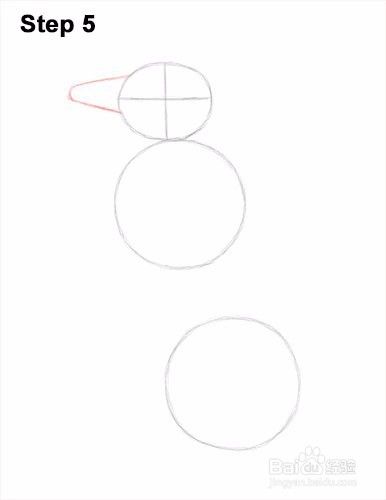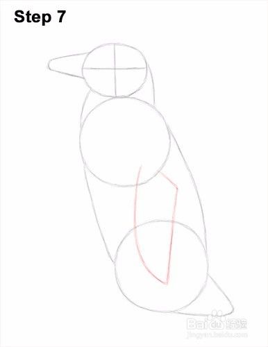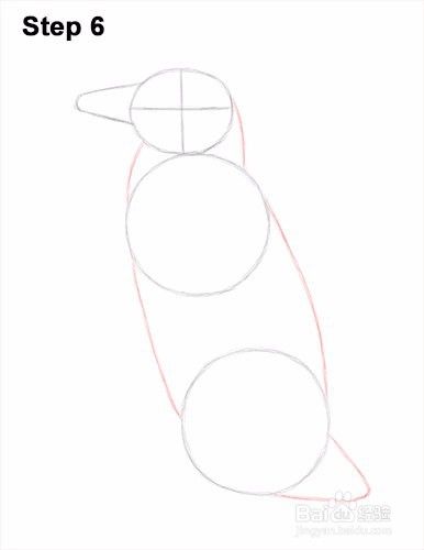 第6步:画两条连接头部和身体的线条,为颈部创建引导。画两条较长的线连接较大的圆圈以完成身体指导。在企鹅身体的底部右侧,画一条短的斜线作为尾巴的指南。