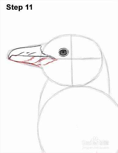 第11步:使用初始弧线画出企鹅喙的底部。按照弧线的基本路径将曲线向上弯曲,使其与右侧的喙顶部相交。在形状中添加几条线,用于详细描述鸟嘴。