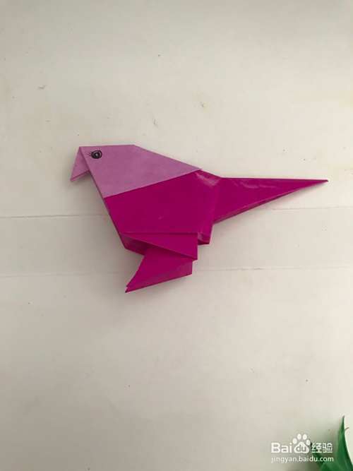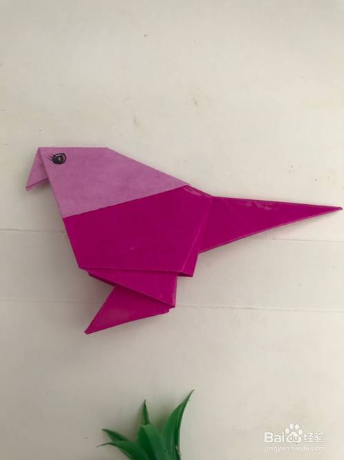 第七步 折完小鹦鹉的尾部 再折它的头部 还是拿起尖角向下弯折一道取开 按折痕向里回折 然后拿起黑色水笔给它画上眼睛 最后再整理一下 一只最简单的小鹦鹉就折叠完成;