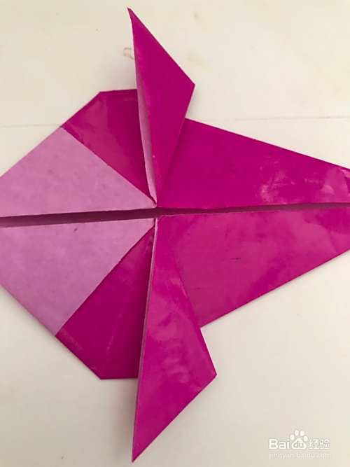 第三步 左边的上下两角都折完之后 再把它们取开 然后按照折痕向里回折 向外折倒
