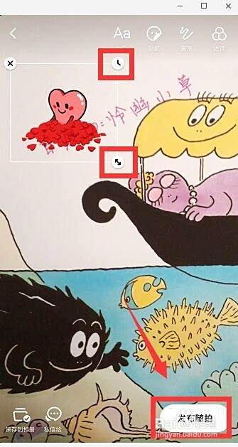 可以将贴纸拉到视频的任何位置,点击贴纸会出现方框,方框右下角图标可以对其大小、倾斜度进行调整,右上角图标可以设置贴纸出现的时长,完成后点“发布随拍”。