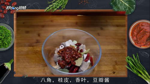 4牛肉中加入适量葱段、姜片、干辣椒、花椒、八角、桂皮、香叶、豆瓣酱。