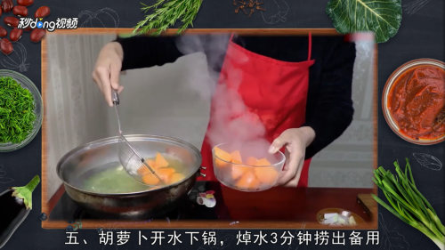 3胡萝卜开水下锅,焯水3分钟捞出备用。