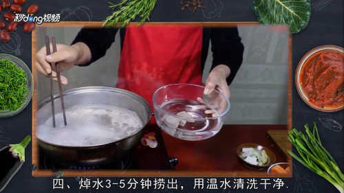 2牛肉冷水下锅加入生姜,料酒去腥焯水3-5分钟捞出,温水洗净。