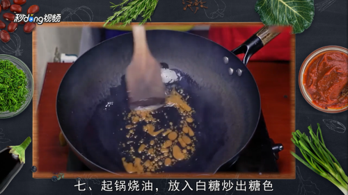 5起锅烧油,放入白糖炒出糖色,放入牛肉等佐料翻炒均匀,加入开水。