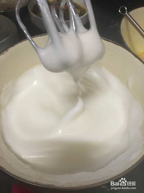 蛋白加糖打发,一定要打发,而且鸡蛋要常温。我是用电动打蛋器,所以很快