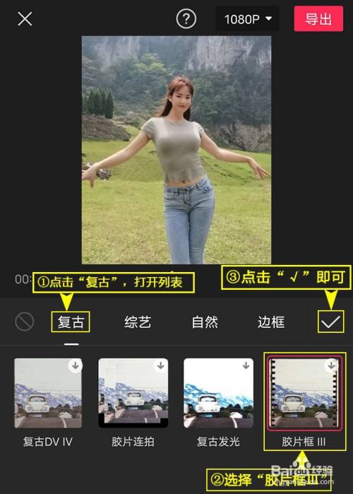 选择特效。点击“复古”选项卡,打开特效列表,选择“胶片框Ⅲ”特效,点击列表右上角的“√”即可。
