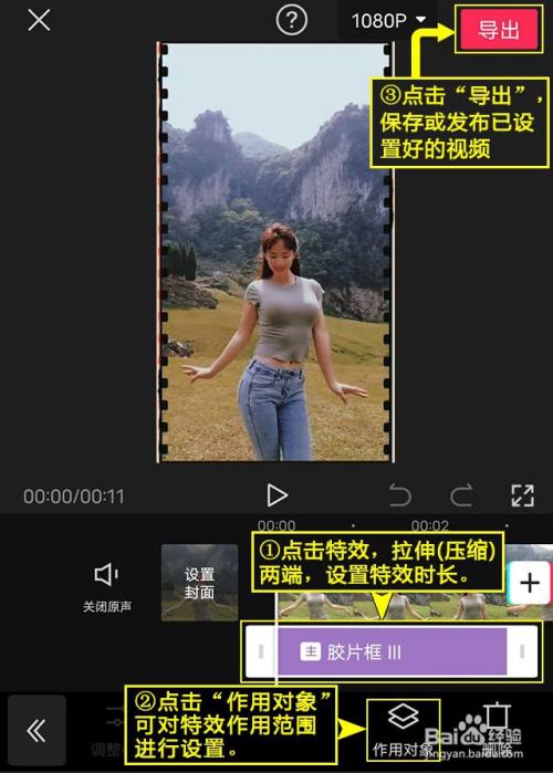 设置特效。点击已添加的特效,拉伸(压缩)特效轨道两端,设置特效时长;点击“作用对象”,可对特效作用范围进行设置;点击“导出”,保存或发布已设置好的视频。