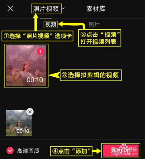 导入视频。选择“照片视频”选项卡,点击“视频”,打开视频列表,选择拟剪辑的视频,点击右下角的“添加”。