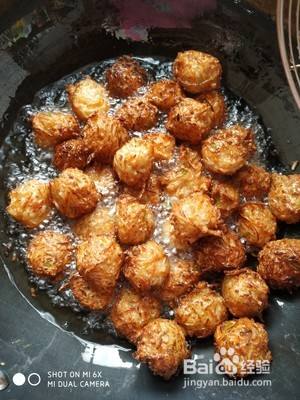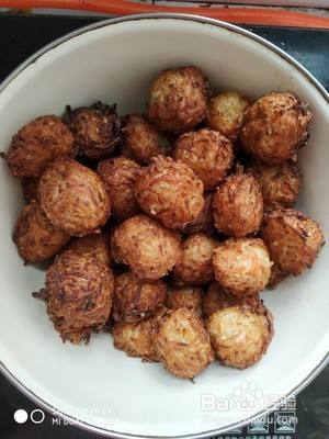 油温5成热,调中小火将拌好的材料捏成如图丸子就可以下锅炸,边捏边下锅边炸。