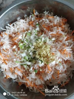 大葱和姜切碎放入萝卜丝里面。