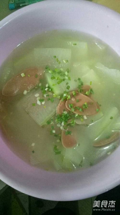 冬瓜放入锅里加适量水,用筷子挑一点猪油,烧开后下火腿肠和姜末