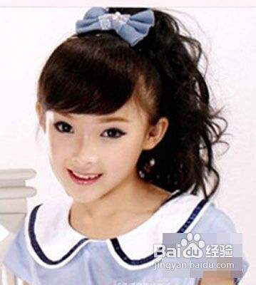 非常有淑女气质的一款小女孩发型绑扎方法,先把头发做成大卷的卷发,然后扎起一个高马尾辫,刘海部分是顺滑的片状刘海,很好地修饰了脸型。戴上蝴蝶结发饰,变得优雅动人。