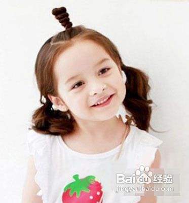 这是一款很有创意的头顶“葫芦宝塔”的小辫子发型,可谓是新款的儿童发型绑扎方法,在发顶位置梳起一个类似宝塔状的发髻,然后把两边的头发扎成马尾辫就可以了。