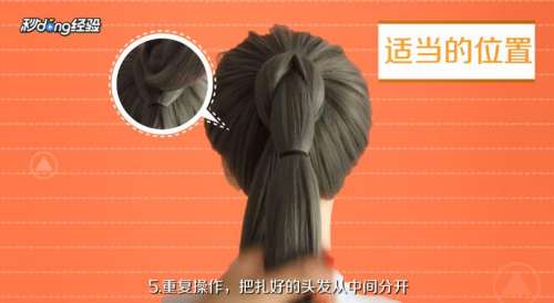 3把上边两个皮筋中间的头发平分成2部分,从中间分开,同时把剩下一半的头发,从中间穿过来。