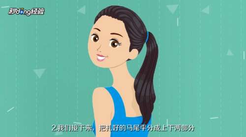 2接下来,把扎好的马尾平分成上下两部分,同时用黑色的小皮筋,在距离大皮筋4厘米处扎起来。