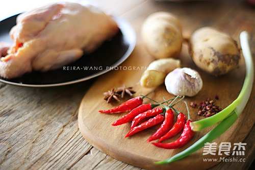 2土豆去皮切块,蒜头切片,葱姜切丝、干辣椒切段、大公鸡洗净剁块备用;